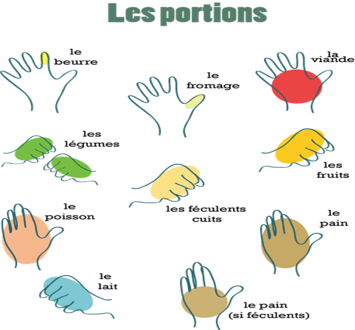 Nos mains sont un outil simple pour adapter nos portions lors du repas en fonction de la nature de l’aliment et de notre âge !