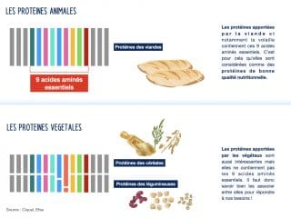 Plusieurs aliments nous apportent des protéines : la viande, le poisson, les œufs, les produits laitiers mais aussi les légumes secs (pois chiches, lentilles, haricots …), les céréales (blé, riz…), le tofu….